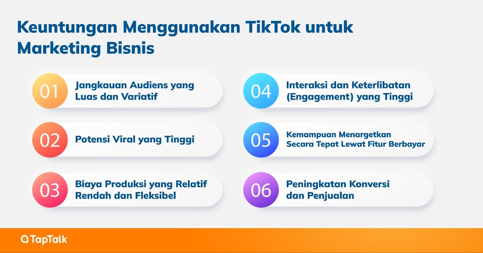 Manfaatkan OneTalk by TapTalk, sebuah solusi Omnichannel terdepan yang memungkinkan tim Anda mengelola semua interaksi dari berbagai platform penting (seperti WhatsApp, Instagram DM, dan Telegram) dalam satu dashboard terpusat. Dengan OneTalk, Anda dapat merespons pelanggan lebih cepat, menyediakan layanan pelanggan yang efisien, dan fokus pada pertumbuhan bisnis, bukan pada kerumitan manajemen saluran yang terpisah. Implementasikan strategi TikTok Anda untuk menarik perhatian, dan biarkan OneTalk membantu Anda mengkonversi setiap lead yang masuk melalui saluran lain menjadi transaksi yang sukses.